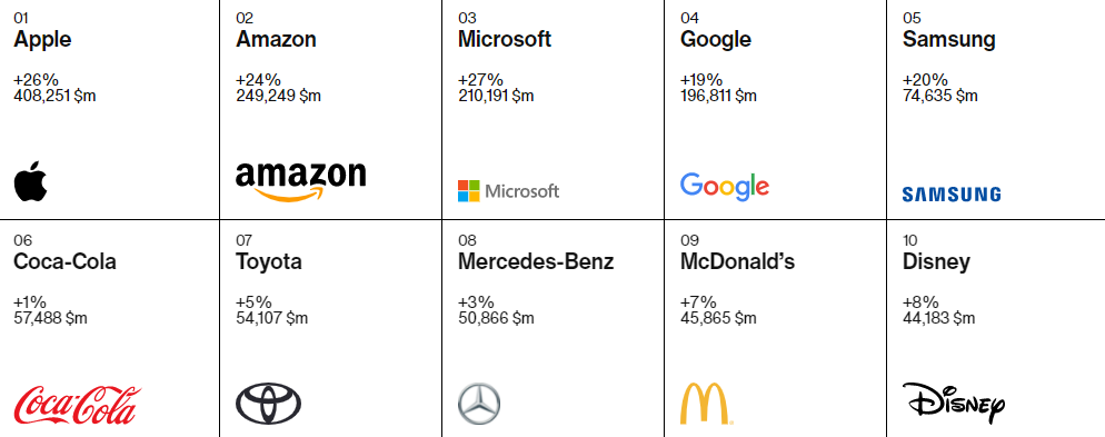Theo đó, 5 cái tên hàng đầu đều thuộc về các công ty công nghệ: Apple, Amazon, Microsoft, Google và Samsung. Coca-Cola xếp thứ 6, do vậy, được xem là thương hiệu phi công nghệ có giá trị nhất. Các vị trí tiếp theo thuộc về các đại diện trong lĩnh vực sản xuất ô tô – Toyota và Mercedes-Benz, lĩnh vực F&B McDonald’s và giải trí Disney.