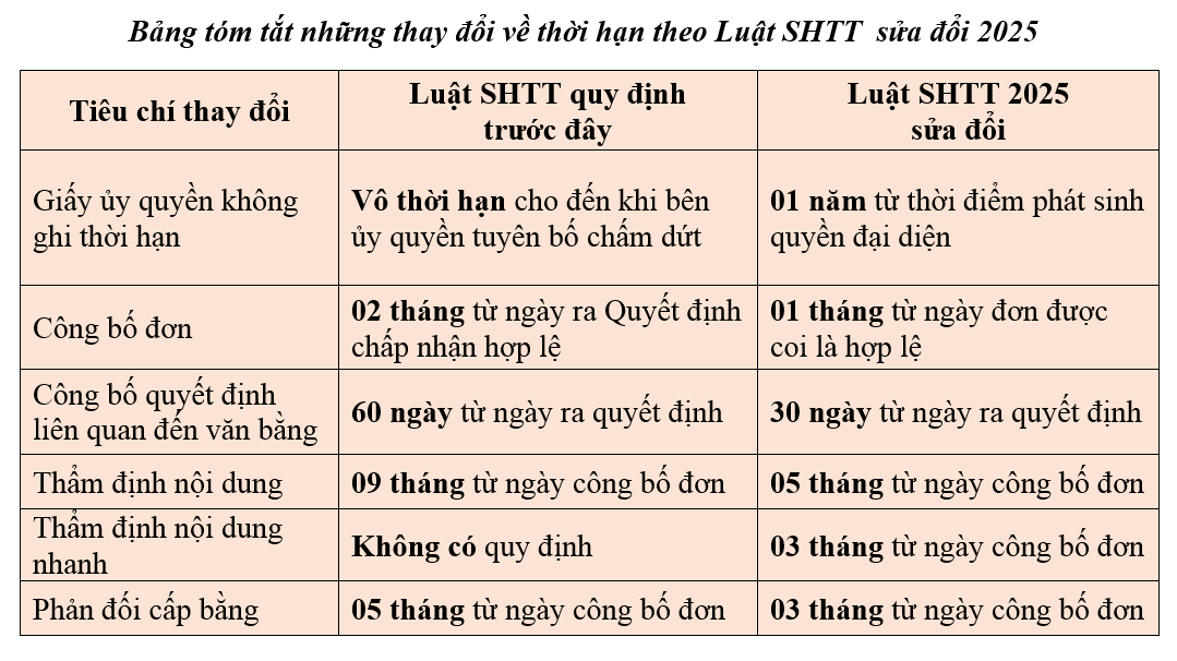 Theo quy định trước đây, giấy ủy quyền không có thời hạn ủy quyền được coi là có hiệu lực vô thời hạn và chỉ chấm dứt hiệu lực khi bên ủy quyền tuyên bố chấm dứt ủy quyền. Luật SHTT sửa đổi 2025 đã quy định văn bản ủy quyền không có thời hạn ủy quyền thì được xác định theo quy định của Bộ luật Dân sự. Cụ thể là, trường hợp không có thỏa thuận và pháp luật không quy định thì thời hạn đại diện ủy quyền là 01 năm, kể từ thời điểm phát sinh quyền đại diện. Quy định này đã tạo ra sự thống nhất giữa Luật SHTT và Bộ luật Dân sự về đại diện theo ủy quyền.