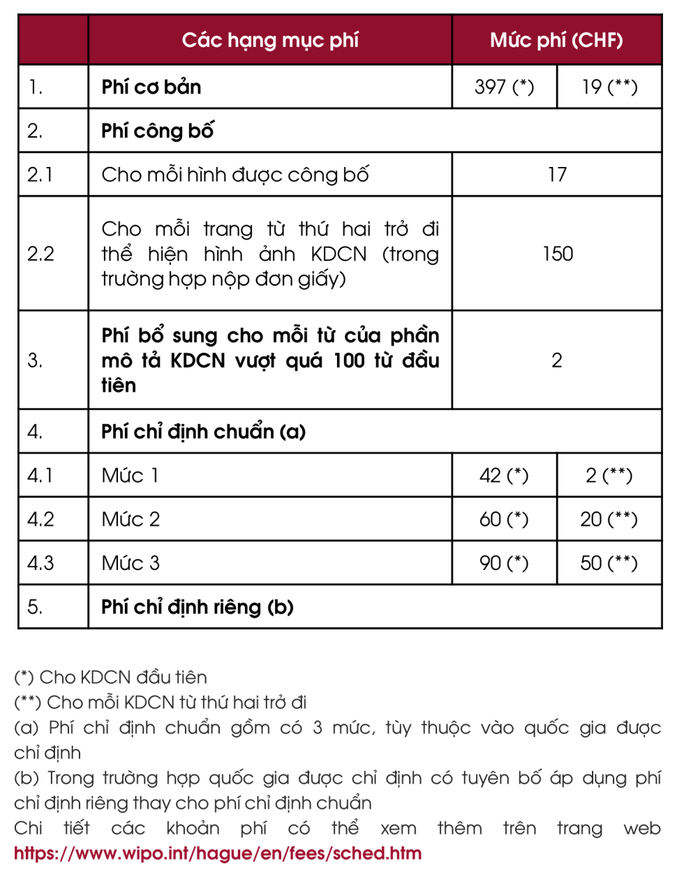 Hiện nay, Việt Nam chưa có tuyên bố về phí chỉ định riêng mà đang dùng trực tiếp mức phí chỉ định chuẩn của Văn phòng quốc tế của WIPO ở Mức 3 (vì Việt Nam có quy định về thẩm định nội dung). Khi đơn đăng ký quốc tế Kiểu dáng công nghiệp theo Thỏa ước La Hay có chỉ định Việt Nam thì sẽ được nhận từ Văn phòng quốc tế của WIPO khoản phí chỉ định chuẩn theo quy định.