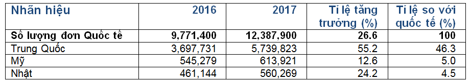 Theo báo cáo các chỉ số sở hữu trí tuệ thế giới (The World Intellectual Property Indicators) của Tổ chức Sở hữu trí tuệ thế giới – World Intellectual Property Organization (WIPO), năm 2017, hoạt động nộp đơn đăng ký quyền sở hữu trí tuệ trên toàn thế giới đã lập kỷ lục mới. Số đơn đăng ký nhãn hiệu toàn thế giới đạt 12,39 triệu đơn, tăng 26,8% so với năm 2016. Trong đó, Trung Quốc vẫn là quốc gia có mức tăng trưởng đứng đầu. Cụ thể, số lượng đơn đăng ký nhãn hiệu ở Trung Quốc tăng 55,2% (chiếm 46,3% tổng số đơn trên toàn thế giới).