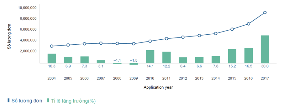 Số lượng đơn đăng ký nhãn hiệu trên toàn cầu từ giai đoạn 2004-2017