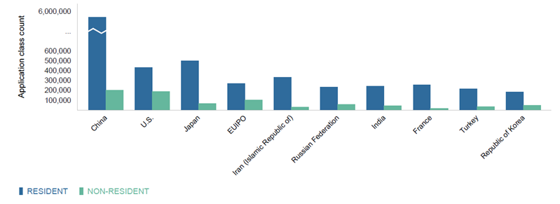 Đến năm 2017, Trung Quốc có hơn 5,7 triệu đơn đăng ký nhãn hiệu, chiếm 78% mức tăng hàng năm của đơn đăng ký nhãn hiệu toàn cầu. Theo sau là Hoa Kỳ với 613.921 đơn. Tiếp đến là Nhật Bản (560.269 đơn), Văn phòng Sở hữu Trí Tuệ Châu Âu (EUIPO) (371.508 đơn) và Cộng hòa Hồi giáo Iran (358.353 đơn). Năm quốc gia hàng đầu này chiếm 62% số lượng đơn đăng ký nhãn hiệu toàn cầu năm 2017, tăng từ 33% so với năm 2007.