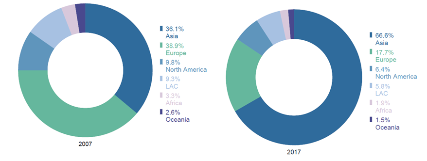 Các quốc gia ở Châu Á (trong đó có Việt Nam) chiếm 66,6% trong tất cả các đơn đăng ký nhãn hiệu trên thế giới trong năm 2017. Đây là mức tăng đáng kể so với tỉ lệ 36,1 % năm 2007.