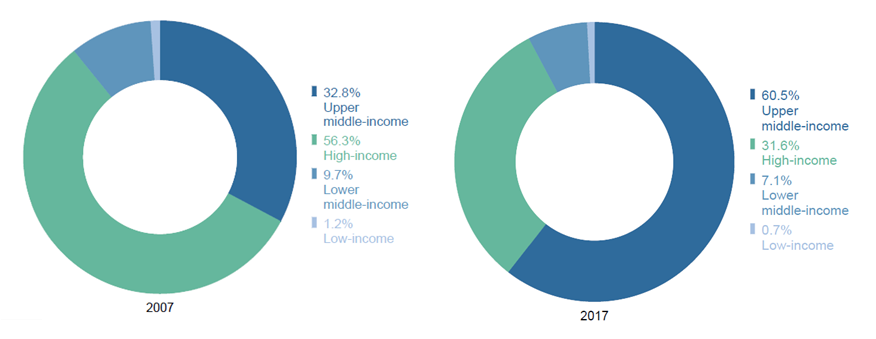 Theo thống kê, số lượng đơn đăng ký nhãn hiệu của nhóm các nước thu nhập cao giảm từ 56,3% năm 2007 xuống còn 31,6% năm 2017. Ngược lại, tỷ lệ đơn đăng ký nhãn hiệu của nhóm quốc gia có thu nhập trung bình cao đã tăng từ 32,8% trong năm 2007 lên 60,5% trong năm 2007.