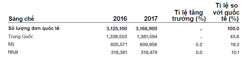 Năm 2017, hoạt động nộp đơn đăng ký quyền sở hữu trí tuệ trên toàn thế giới đã lập kỷ lục mới. Các đơn đăng ký sáng chế đạt 3,17 triệu, tăng trưởng 5,8% so với năm 2016. Đây là một con số kỉ lục. Trung Quốc, Mỹ, Nhật Bản, Hàn Quốc và Đức là những quốc gia có lượng đơn đăng ký sáng chế lớn nhất. Trong đó, Trung Quốc vẫn là quốc gia có mức tăng trưởng đứng đầu. Cụ thể, số lượng đơn đăng ký sáng chế ở Trung Quốc tăng 14,2% (chiếm 43,6% lượng đơn sáng chế toàn thế giới).