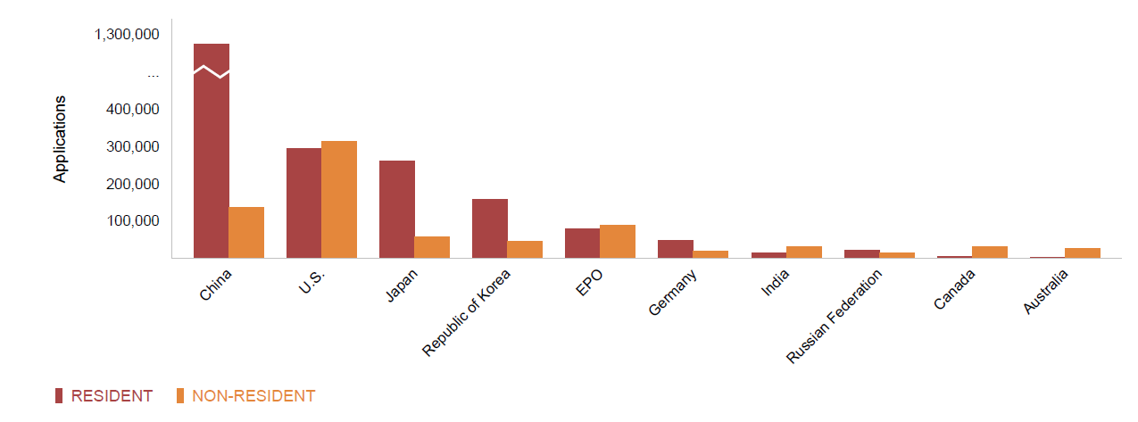 Trung Quốc đã nhận được 1,33 triệu đơn xin cấp bằng sáng chế, gấp đôi số lượng đơn mà Hoa Kỳ nhận được. Nhật Bản được xếp hạng thứ ba, với 318.479 đơn. Tiếp theo là Hàn Quốc với 204.775 đơn đăng ký và Văn phòng Sáng chế Châu Âu (EPO) với 166.585 đơn. Năm quốc gia hàng đầu này chiếm 84,5% tổng số đơn đăng ký sáng chế của thế giới trong năm 2017, cao hơn nhiều so với tỉ lệ 10 năm trước đây (2007) của nhóm các quốc gia này (75,2%).