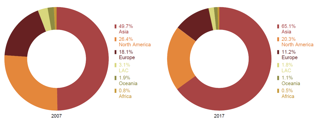 Các quốc gia ở châu Á đã nhận được khoảng 2,1 triệu đơn đăng ký sáng chế trong năm 2017, chiếm 65,1% tổng số thế giới . Tổng cộng của Châu Âu và Bắc Mỹ chỉ dưới 1 triệu đơn. Tỷ lệ đơn đăng ký sáng chế của châu Á tăng từ 49,7% trong năm 2007 lên 65,1% vào năm 2017, chủ yếu nhờ vào sự tăng trưởng mạnh mẽ tại Trung Quốc, chiếm khoảng 2/3 tổng số đơn đăng ký trong khu vực này. Hoa Kỳ chỉ chiếm hơn 1/5 tổng số đơn đăng ký sáng chế thế giới, trong khi Châu Âu chỉ chiếm hơn 1/10. Tỷ lệ chung của Châu Phi, LAC và Châu Đại Dương là 3,4%.